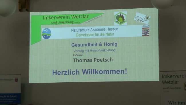 Am Donnerstag, 6.9. hatte der Imkerverein wieder mal in die Naturschutz-Akademie eingeladen. Etwa 60 Personen waren der Einladung zum Thema „Gesundheit & Honig“ gefolgt. Sie hörten einen spannenden Vortrag vom Vorsitzenden Thomas Poetsch aus der Sicht eines Ernährungsberaters. Er sprach über Zusammenhänge zwischen den wertvollen Inhaltsstoffen des Honigs und einigen ernährungsabhängigen oder genetisch bedingten Krankheitsbildern…