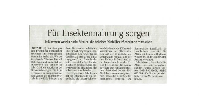 Große Frühblüher – Aktion für Insekten     Noch 30 Schulen, Kindergärten oder KiTas gesucht! Imkerverein Wetzlar e.V.   In einer großen und gemeinsamen Aktion engagiert sich der Imkerverein Wetzlar e.V. mit vielen Schulen aus Wetzlar und dem Kreisgebiet für Insekten im Frühjahr 2021. Es werden Flächen sowohl innerhalb des Schulgeländes als auch öffentliche Flächen bepflanzt! Bis…