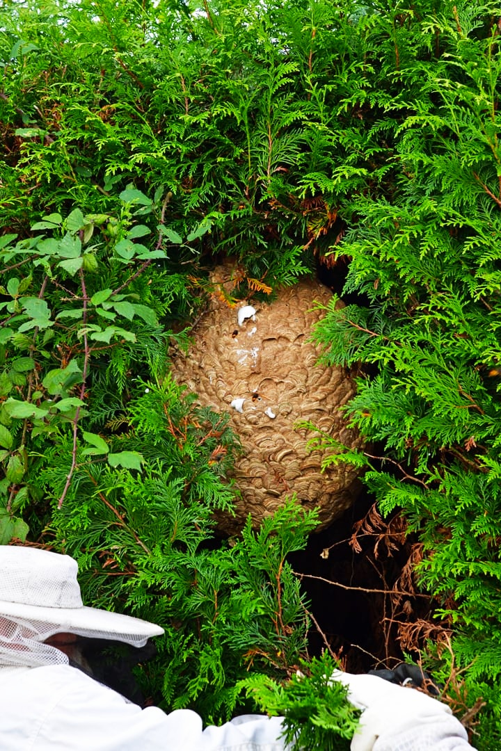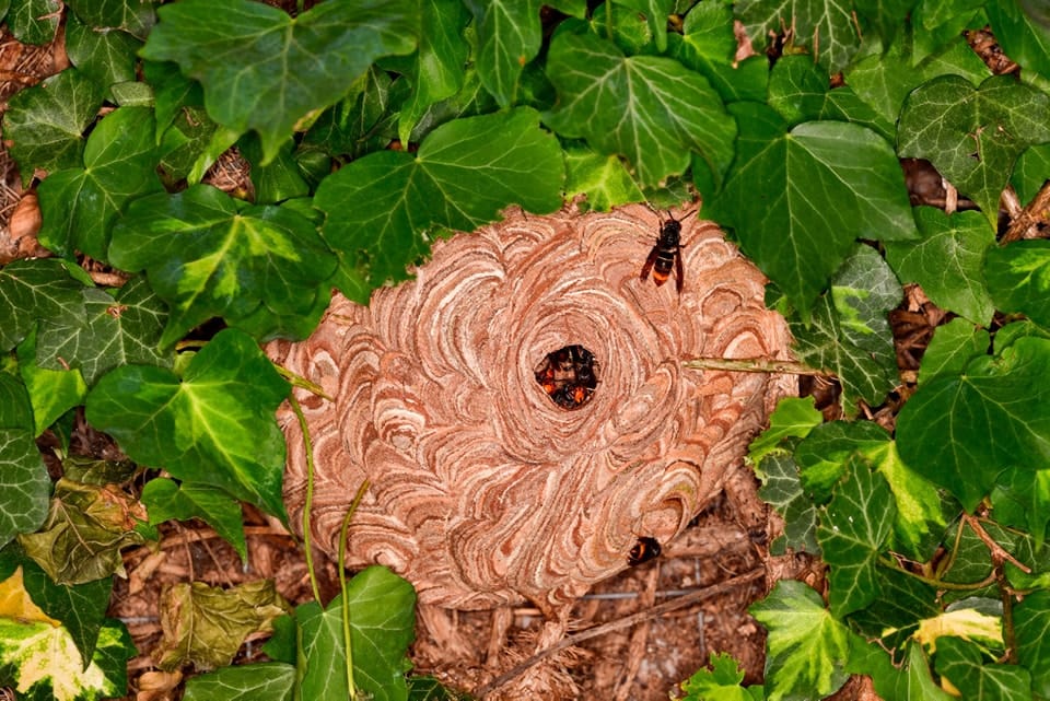 Hier sind einige Bilder von Nestern zur Unterscheidung unserer heimischen Vespa Crabro und der Asiatischen Hornisse: