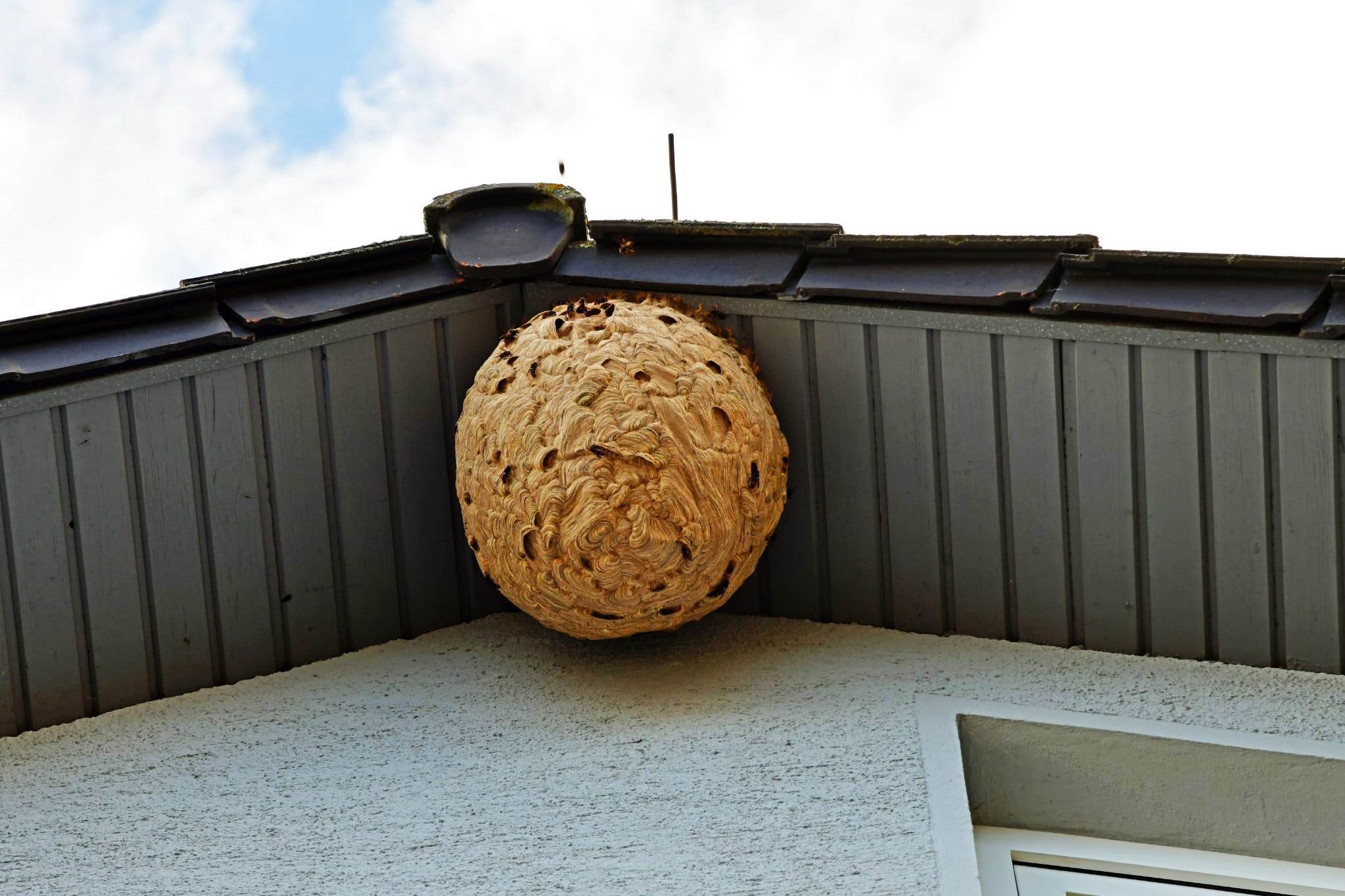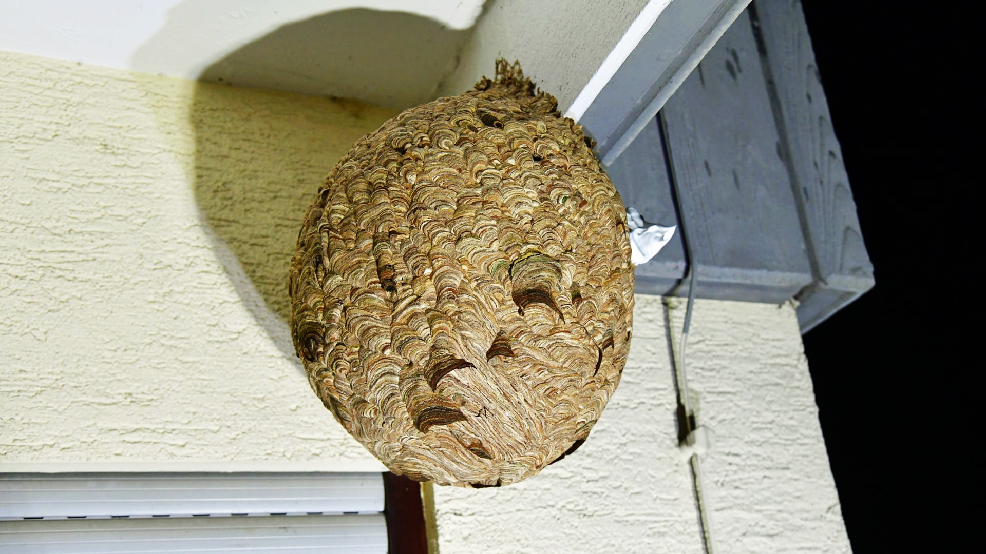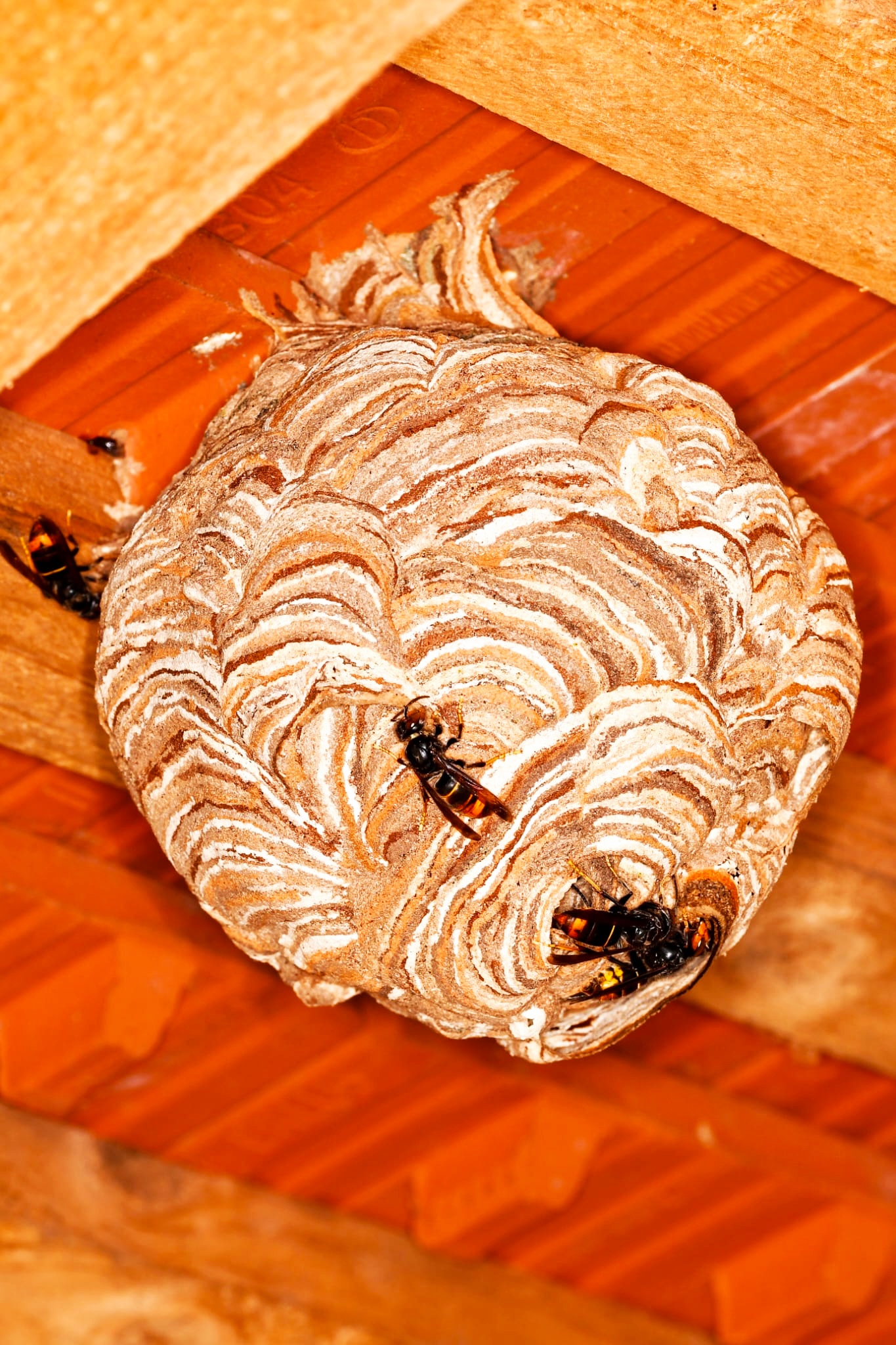Diese Primärnester (Mai 1-2 Tennisbälle groß) entstehen nahezu ausschließlich im urbanen Umfeld. In Holzschuppen, Giebeln, Carports, Dachüberständen. Hier ist es warm und trocken und meistens ungestört. Auffällig ist die Nähe zu Kindergärten, Schulen, Spielplätzen. Hintergrund könnte das oft gute Futterangebot dort sein.