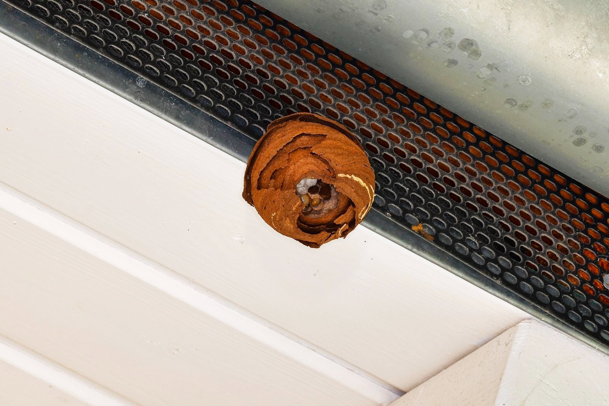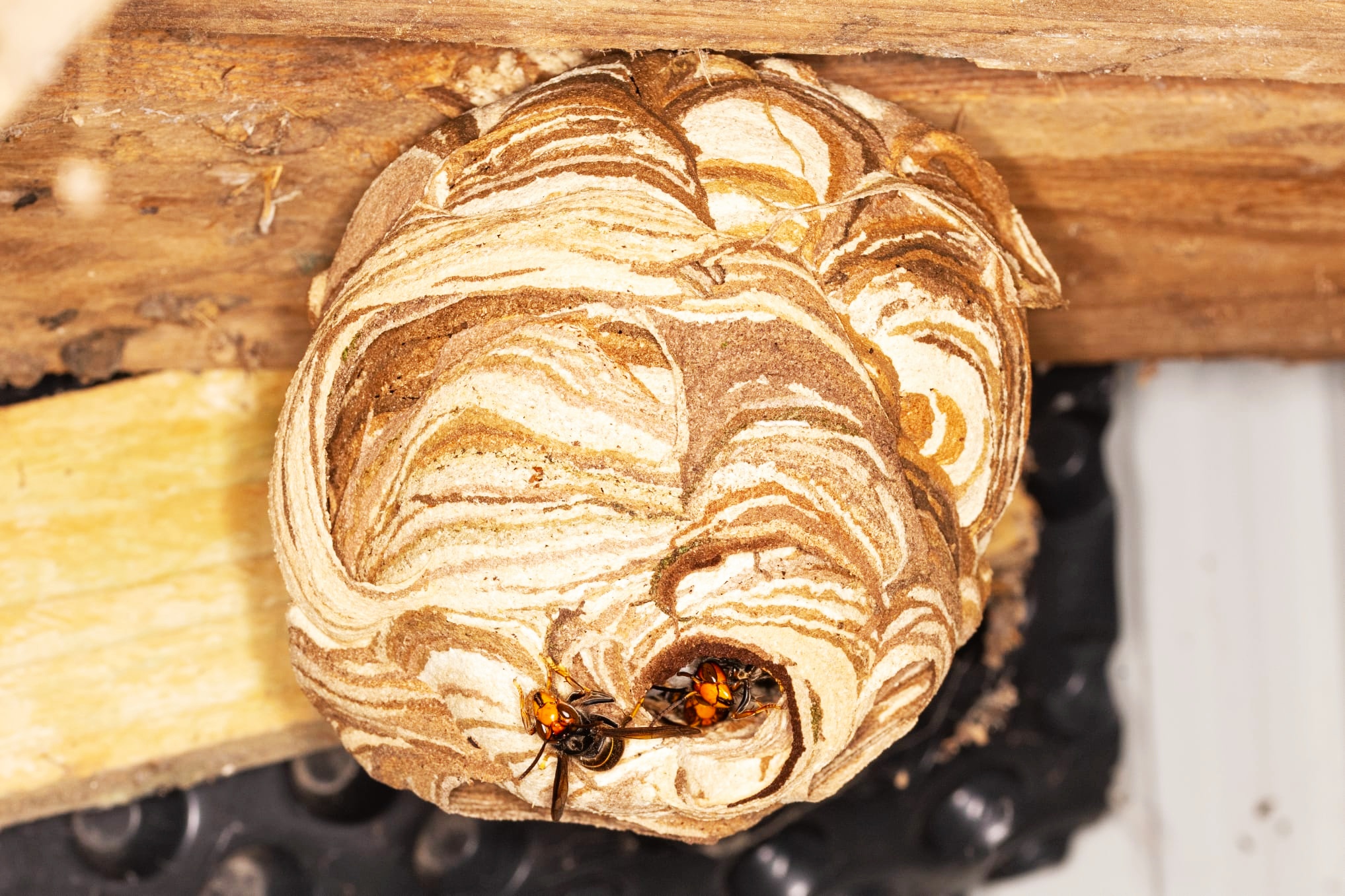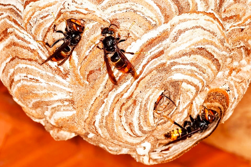 Diese Primärnester (Mai 1-2 Tennisbälle groß) entstehen nahezu ausschließlich im urbanen Umfeld. In Holzschuppen, Giebeln, Carports, Dachüberständen. Hier ist es warm und trocken und meistens ungestört. Auffällig ist die Nähe zu Kindergärten, Schulen, Spielplätzen. Hintergrund könnte das oft gute Futterangebot dort sein.