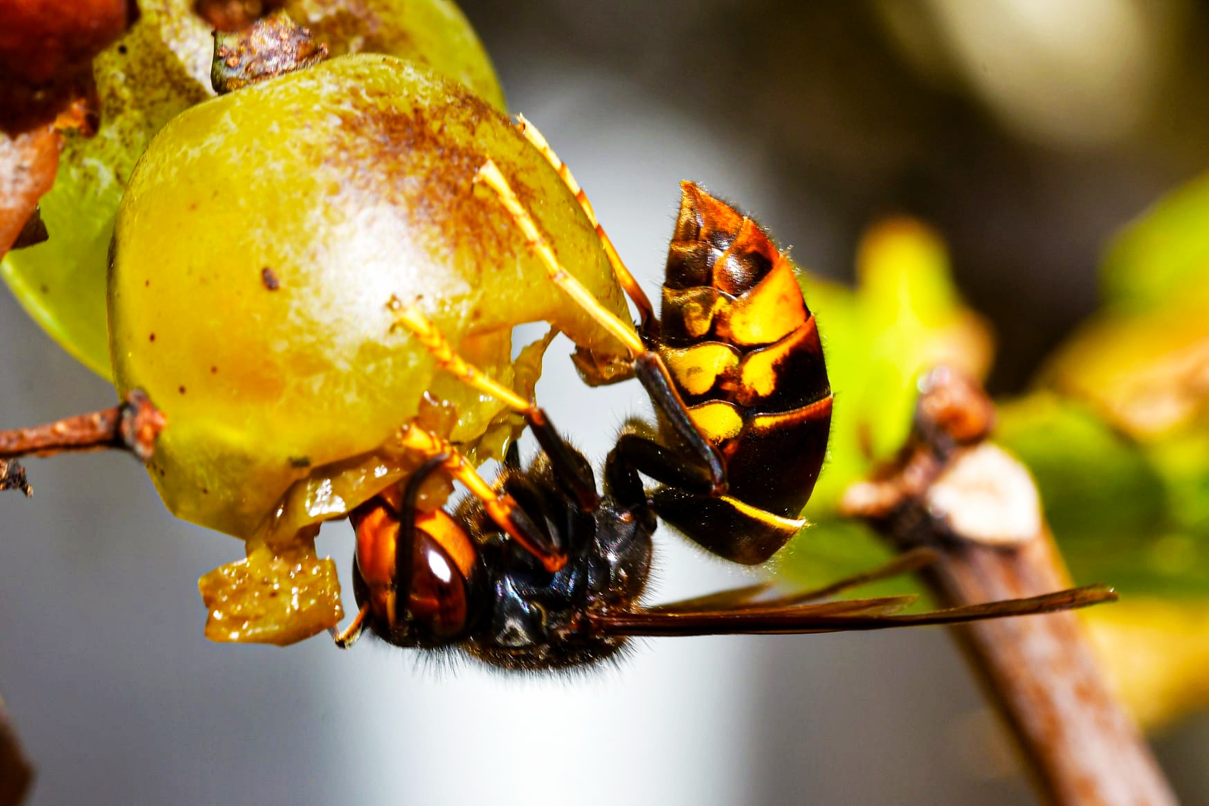Wie die VV auch frisst sie gerne und ausführlich Wespen. Die Asiatische Hornisse hat ein sehr weites Beutespektrum. Sie ernährt sich von Spinnen, Schwebfliegen, Wespen, Wildbienen (??) und im Herbst, wenn nichts anderes mehr zu finden ist von Honigbienen. Diese Hornisse schädigt Wein – und Obstbestände. Erst wenn der Bestand an Wespen zurück geht, spüren auch wir Imker das. Dann gehen sie an unsere Bienen. Bei warmen Flugwetter stehen die Hornissen (besonders VV) vor dem Flugloch in der Luft und fangen die ankommenden Bienen ab. Die VV sind dabei an ihren gelben Beinen und Füßen dabei gut zu erkennen. Fluglochbeobachtungen (30 min) nach der großen Tageshitze gegen Abend helfen bei der Erkennung. Da die Asiatischen Hornissen bei Temperaturen noch aktiv sind, wenn unsere Bienen schon wehrlos in der Wintertraube sitzen, kann es passieren, dass die Asiatische in die Völker reingeht und ganze Völker zerstört. Hier hilft nur die starke Reduzierung der Fluglochgröße.
